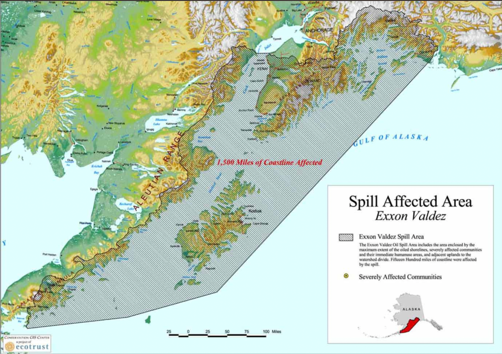 On March 24, 1989, just after midnight, the Exxon Valdez oil tanker ran aground on Bligh Reef in Prince William Sound, an inlet in the Gulf of Alaska, on its way from Valdez, Alaska to California. Due to delayed efforts to contain the spill and stormy conditions, 11 million gallons of North Slope crude oil dispersed into the waters eventually polluting 1,300 miles of shoreline and adjacent waters. This was the largest environmental disaster in US history up to that point in time. At risk was “the delicate food chain that supports Prince William Sound’s commercial fishing industry… ten million migratory shore birds and waterfowl, hundreds of sea otters, dozens of other species, such as harbor porpoises and sea lions, and several varieties of whales.” In the end an estimated 250,000 seabirds, 2,800 sea otters, 300 harbor seals, 250 bald eagles, as many as 22 killer whales, billions of salmon and herring eggs were killed. More than 25 years after the spill the killer whale population, the herring population (once a life source for the region), several bird species had not recovered, and pools of oil were still found under and between rocks along the shore line.